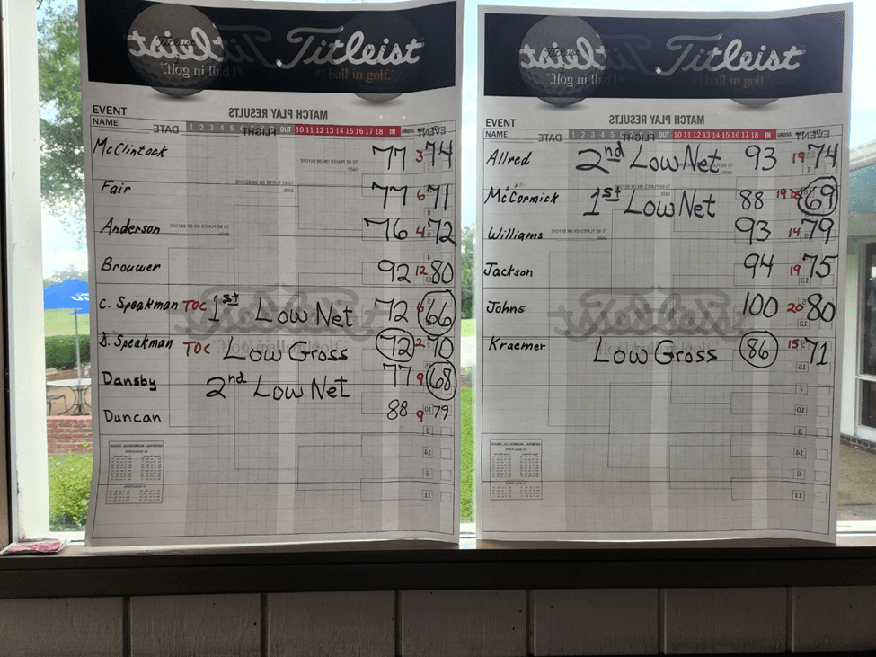 Next tournament is Thursday, June 23rd at 10 AM. This will be a Best 9 tournament. Keep two scores, net and gross. Pick 9 best net and 9 best gross scores. Must use 2 Par 5’s, 2 par 3’s and 5 Par 4’s for each.