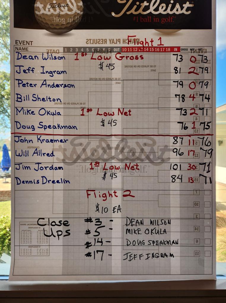 We had 10 players…6 First Flight and 4 Second Flight. Paid 2 winners in First and one winner Second Flight. Rain had been predicted but turned out to be a beautiful day!!! Had a tie for low Gross with both Dean Wilson and Mike Okula shooting 73. In Second Flight, Jim Jordan used all of his handicap strokes to come in with a one stroke under his handicap net 71! Dennis Dreelin did the same ending up in a tie with net 71’s so in a scorecard playoff Jim ended up the winner. Great Job Jim!