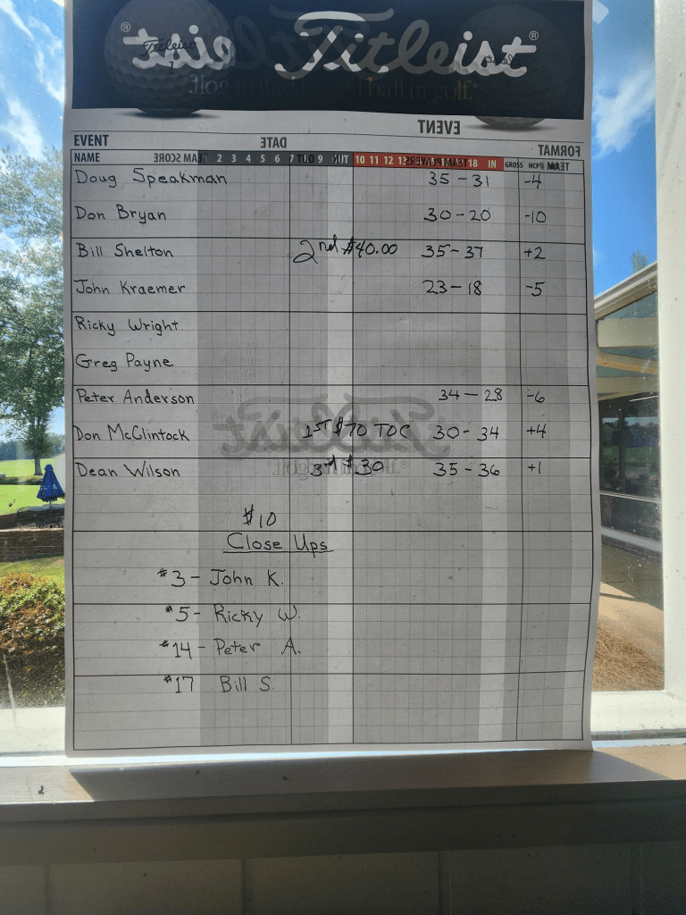 We held our monthly weekend tournament for July on the 29th on the East Course. Prior to the tournament we only had 5 players signed up. The day of 4 more players showed up for a total of 9 of our 31 members playing. We had three winners and four members winning closeups. Don McClintock qualified for the TOC tournament in October. Event sheet is attached below.