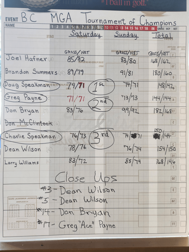 Congratulations to Greg for Second Place and his Hole In One $100 prize money! Pictures of the final 4 some all leading the final day! Doug Speakman, Greg Payne, Charlie Speakman and Larry Williams!