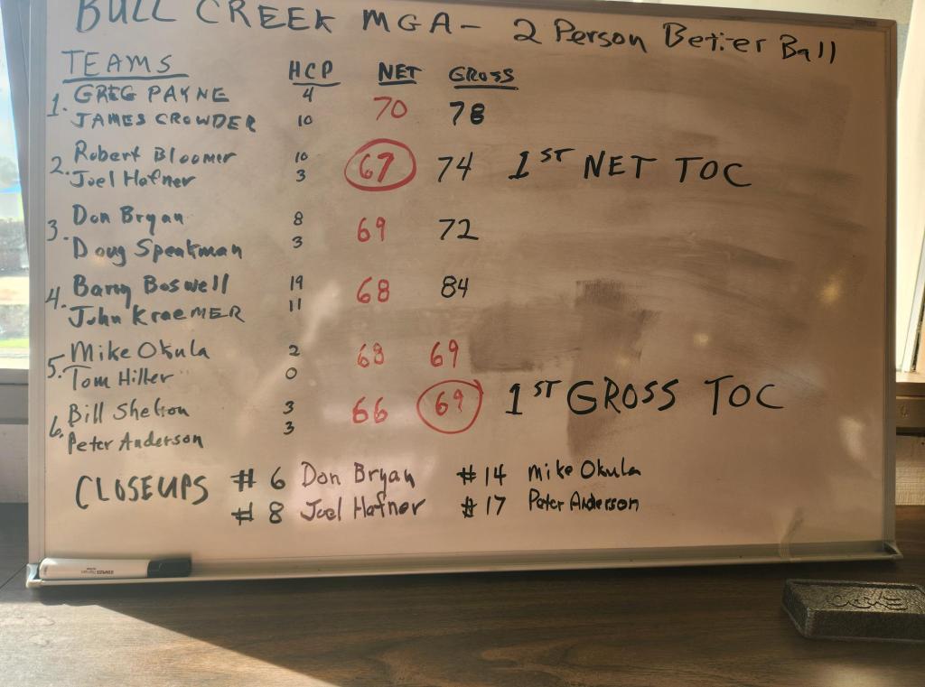 We worked it our with Bull Creek for us to play at the same time that Red Oak shot guns their tournament. We will get our hole assignment and scorecards and be prepared to tee off at 10 AM weather permitting. This will be an Individual Medal tournament. If there are enough players it will be flighted. If not we will pay 1st Gross, 1st Net and the rest net. All golfers will get their full handicap. Sign up sheets and rules are posted in the Snack Bar on the Bulletin Board.