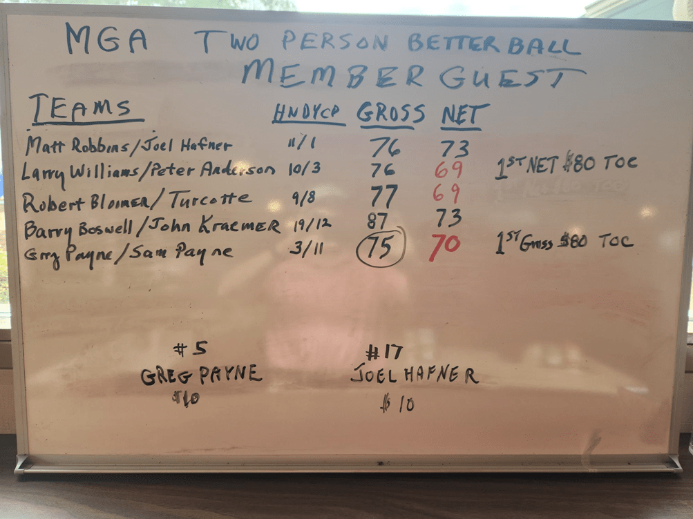 Greg Payne and his wife, Sam (Samantha) won First Gross and Larry Williams and Peter Anderson won First net but only in a scorecard playoff! We only did two closeups won by Greg Payne and Joel Hafner.
