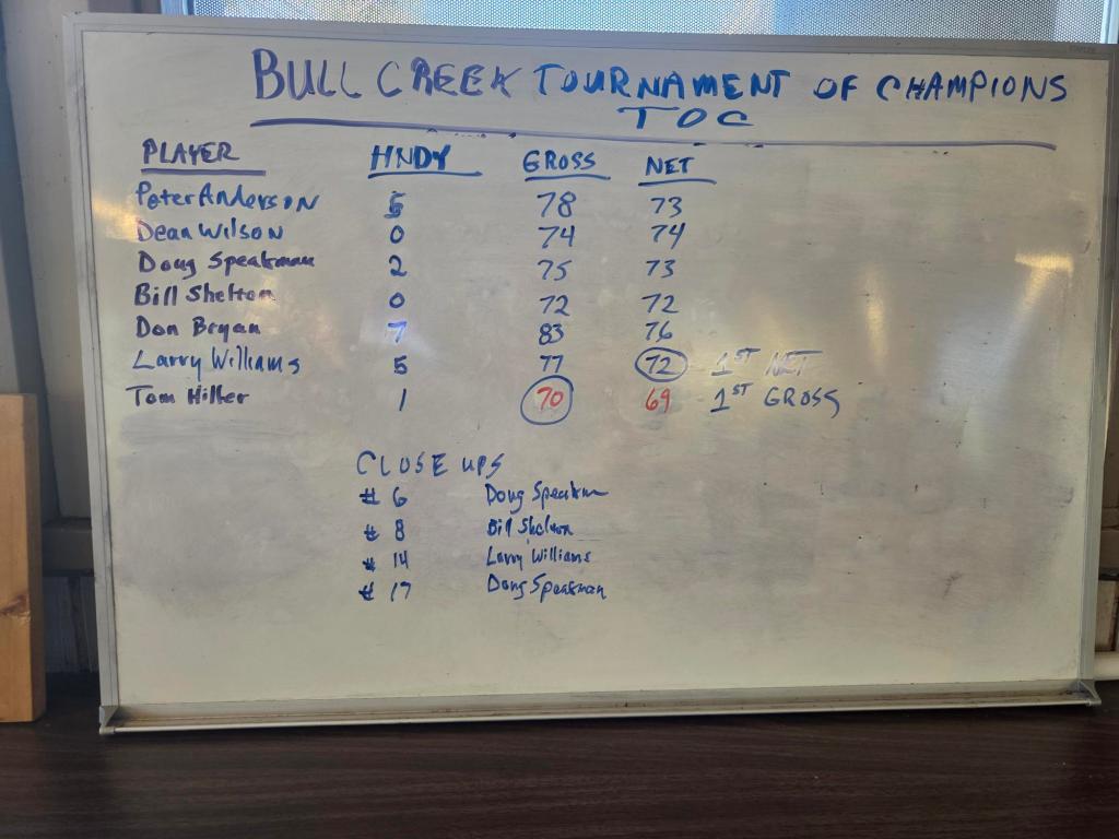 This year we are putting BOTH the GROSS Champion AND the NET Champion on the Trophy. Tom Hiller player absolutely great, throwing in putts from all over the place! He shot 2 under par gross! Great job Tom! Larry Williams squeaked by with a win over Bill Shelton by winning in a scorecard playoff! I look forward to having a lot more winners next year!